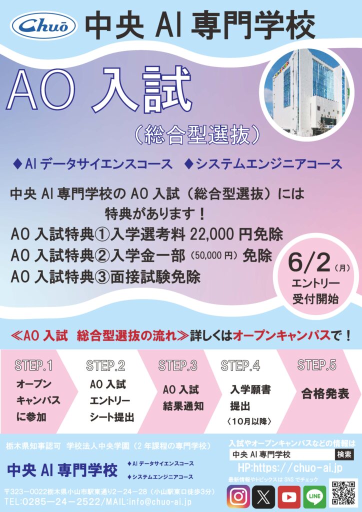 中央AI専門学校の総合型選抜(AO入試)にはたくさんの特典あります。 早いスタートがレベルUPにつながる! 詳しい内容はお気軽にお問い合わせください。 お問い合わせ先 入学願書受付(入試・オープンキャンパスについてのご質 […]