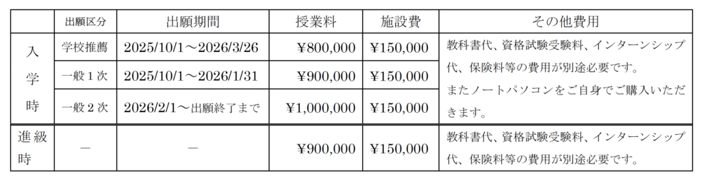 | 出願基準 | 入学金 | 授業料 | 施設費 |